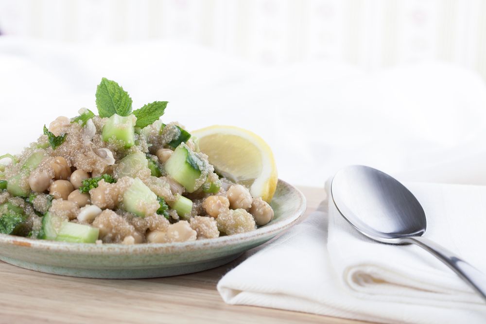 - В большой миске соедините отварной амарант, нут, овощи и зелень.