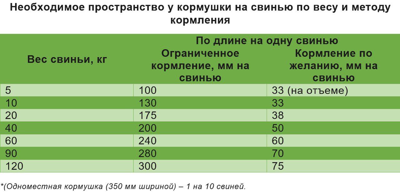 Корм можно давать свиньям через систему жидкого кормления три-четыре раза в день, можно кормить через кормовые воронки ограниченно или без ограничений. Системы жидкого кормления имеют ряд преимуществ. Внутри группы все свиньи, как правило, пьют примерно с одинаковой скоростью, тогда как количество сухого корма, которое они могут съесть, сильно различается от свиньи к свинье. Требования к пространству для кормления показаны в таблице 5.