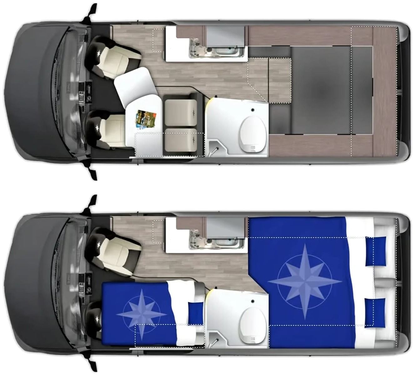 В течение дня в обеденной зоне используется раздвижной стол на четырех человек. Они смогут сидеть на двухместном заднем сиденье и поворотных сиденьях кабины. В фургоне есть отсек для душа, разделяющий обеденную и спальную зоны. Через проход – в кухонной зоне, находится комбинированная раковина и плита, микроволновая печь, холодильник Vitrifrigo и скрытая выдвижная столешница. Водонагреватель/печь Truma Combi подает горячую воду в кран на кухне и в душ в ванной.