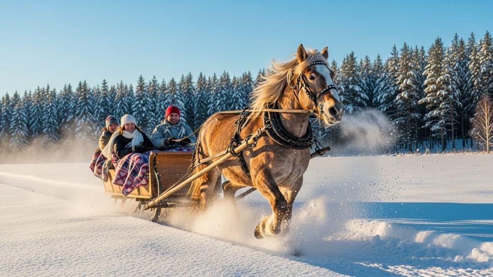 Катание на санях с лошадьми — одна из самых популярных зимних активностей. Проводятся по заявкам, в основном в выходные и праздники (Новый год, каникулы).