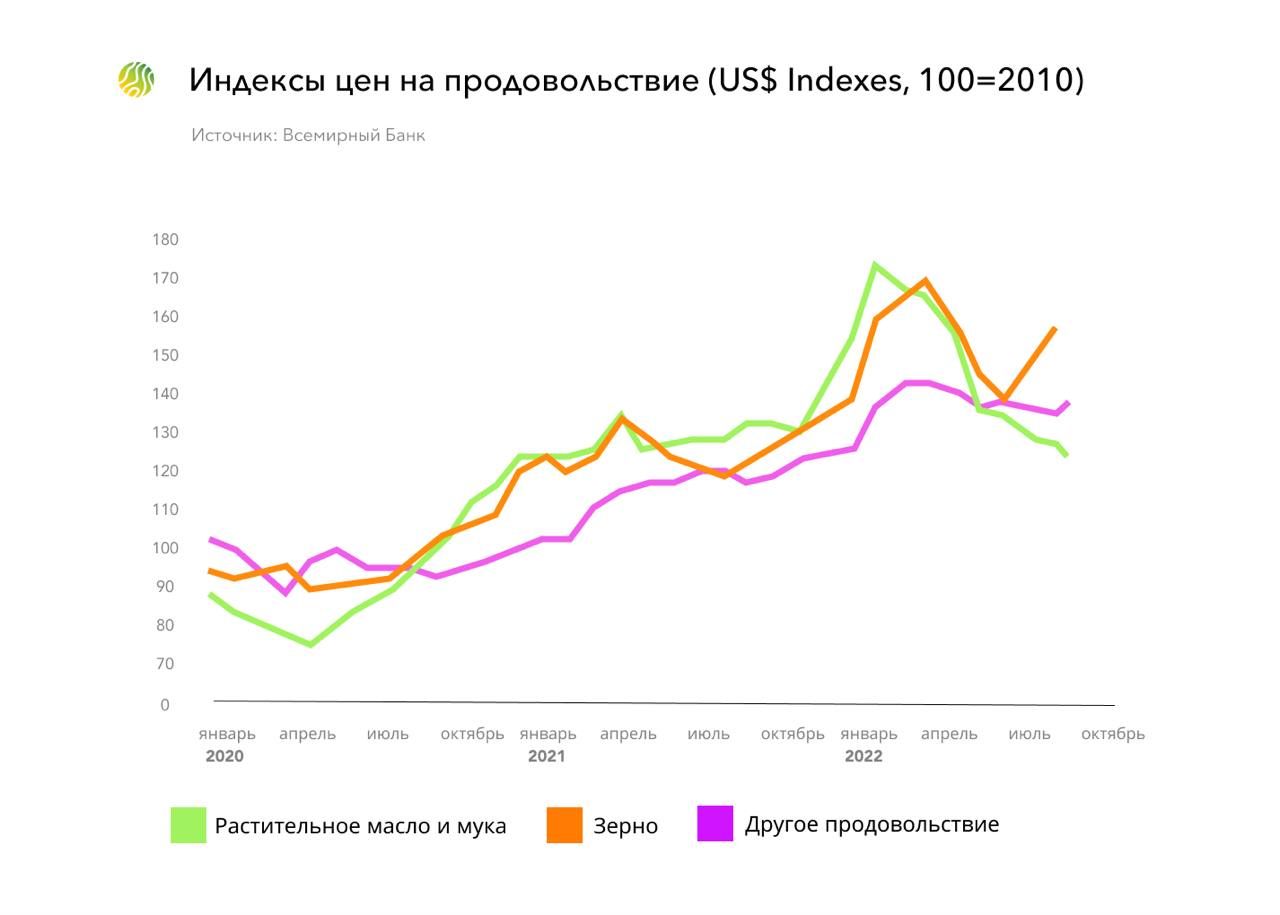 Россия и Украина обеспечивают почти 20% мирового рынка зерновых; до последнего времени Украина поставляла более 50% всего подсолнечного масла мирового рынка. В апреле/мае 2022 года, когда украинские порты на Черном море были заблокированы, цены на продовольствие достигли своего пика – тогда трейдеры ожидали, что украинский экспорт удобрений, зерновых и масличных какое-то время будет оставаться заблокированным, а российский экспорт ограничат санкции. Как следствие, по сравнению с предыдущим годом цены выросли почти вдвое; но Черноморская зерновая инициатива, позволяющая вывезти зерно из зоны боевых действий, и то, что экспорт удобрений и продуктов питания из России не подпал под санкции, непосредственно повлияли на глобальные рынки зерновых и масличных культур. В результате летом 2022 года цены снизились примерно на 10–15%, но цены на удобрения удвоились. Незадолго перед этим мир уже потрясал скачок цен – в 2020-2021 году рост себестоимости и перебои с поставками вызвала пандемия COVID-19.