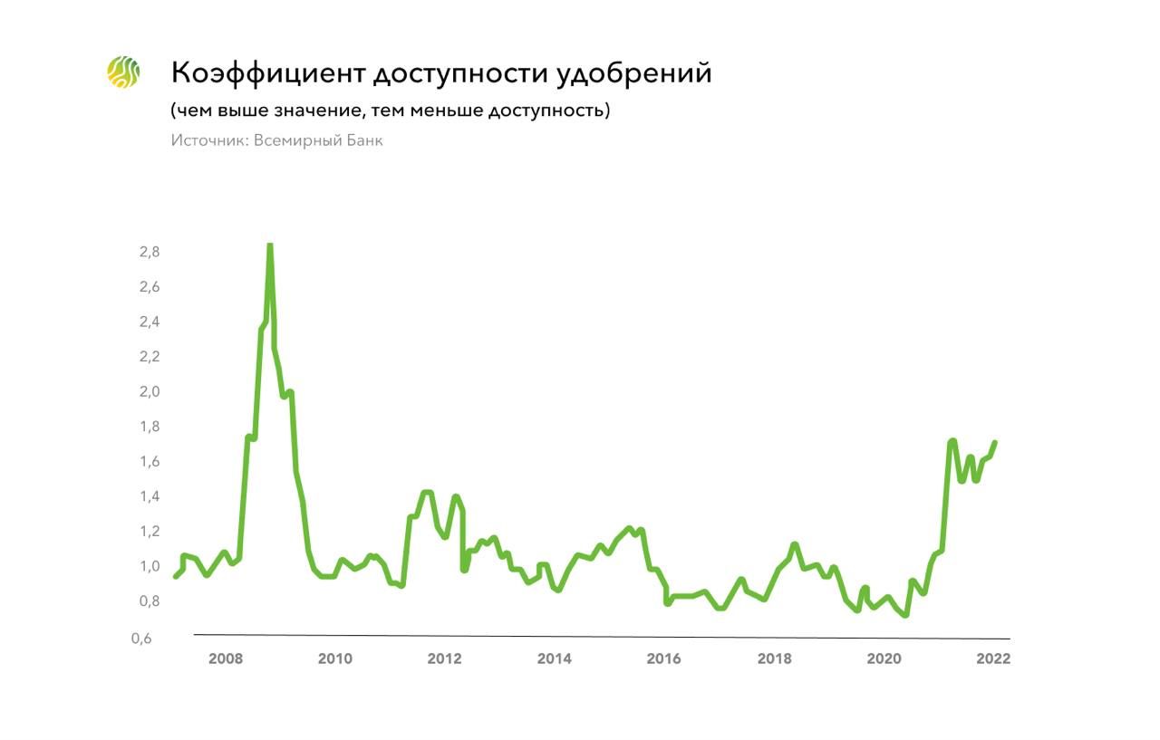 Мировые рынки зерновых и масличных были напряженными еще до кризиса; причина –сокращение поставок от крупных экспортеров, включая Россию и Канаду, и рекордно высокого импорта масличных в Китай. Неэластичный спрос привел к тому, что небольшое падение мировых урожаев вызвало значительный рост цен на зерновые и семена масличных культур. Глобальные трейдеры внимательно следят за ежемесячными международными прогнозами урожая и соотношением мировых запасов к мировому потреблению. Если отношение запасов к потреблению падает ниже определенного порога, цены на продовольствие бурно растут. Но если цены на удобрения поднимаются выше цен на продовольствие, производители этого продовольствия неизбежно сокращают объемы закупок удобрений – они больше не могут себе их позволить. Индекс доступности удобрений Всемирного банка, измеряющий соотношение цен на удобрения и продовольствие, сегодня находится на исторически высоком уровне и отражает текущую ситуацию.
