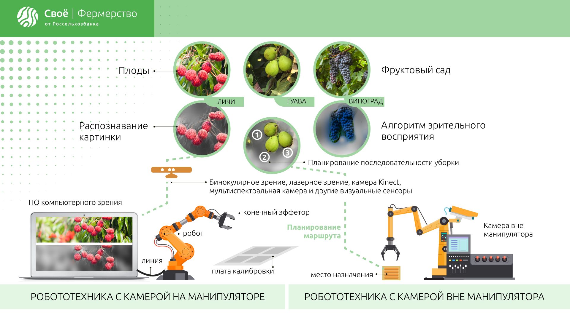 Собирать кукурузу, ячмень и пшеницу довольно просто. Это можно сделать с помощью небольшой переделки комбайна, который, как трактор, становится автономным. Однако мягкие фрукты собрать труднее: они требуют ловкости рук, поэтому для этой задачи используют роботов с манипуляторами и машинным зрением. Робот «видит» окружающее пространство при помощи камер, сенсоров и датчиков, которые расположены на манипуляторе или вне его, распознает нужные объекты и бережно собирает их в контейнер. Сегодня на поток поставлена роботизированная уборка яблок, винограда, томатов и сладкого перца, но собирают роботы с манипуляторами и машинным зрением и другие фрукты, и даже ягоды.