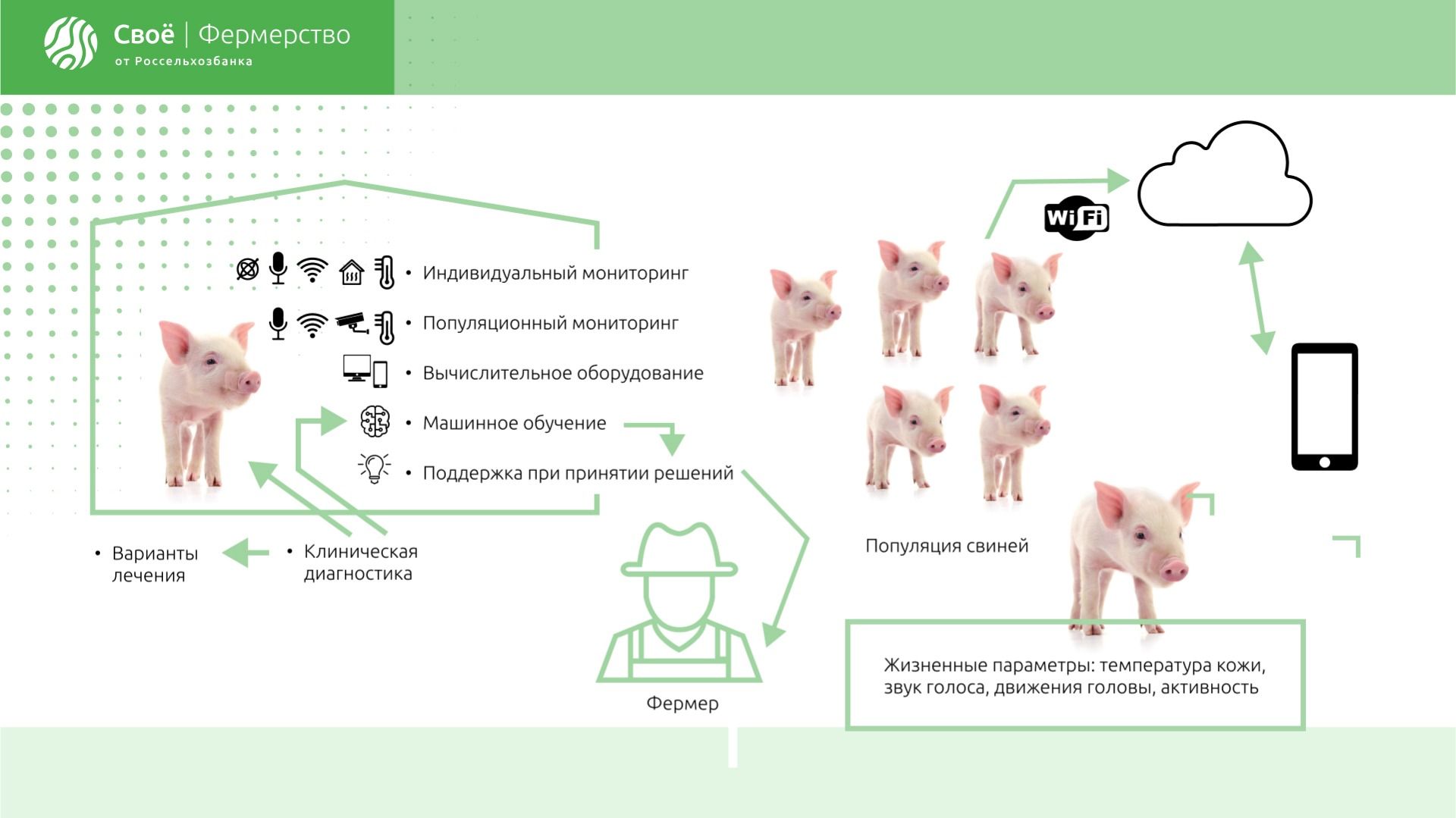 В помещениях для свиней устанавливают уникальные устройства, которые автоматически подсчитывают количество голов животных. Устройства оснащены камерами и датчиками, отслеживающими передвижение свиней, так одно животное не будет подсчитано дважды. Умные камеры также отслеживают поведение свиней и отправляют сигналы в случае аномалий или травм.