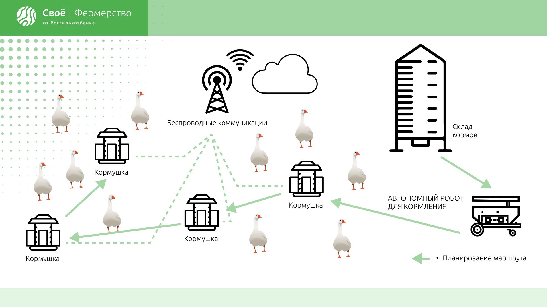 Специально разработанная система Chickenboy расположена на потолке и контролирует ситуацию в сарае. Она может обнаружить неактивных птиц – и птиц с неадекватным поведением, чрезмерно влажную подстилку и т.д. Фермер отслеживает весь процесс на экране ПК. Автономный робот для кормления забирает корм для птиц на складе и планирует маршрут по птичнику, чтобы обойти все кормушки.