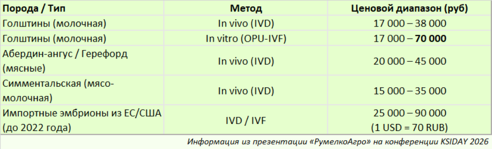 В настоящее время российские эмбрионы голштинов, полученные методом IVD, стоят 17–38 тысяч рублей, при этом цена на эмбрионы, полученные в лабораториях, может достигать 70 тыс. рублей. Спикер напомнила, что до 2022 года цена за один эмбрион из США составляла 25–90 тыс. рублей (при курсе доллара 70 рублей) в зависимости от породы и генетики.