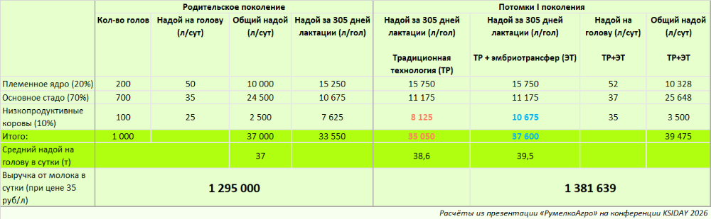 Можно ли зарабатывать на генетике больше, чем на молоке? В 2025 году в рамках аукциона элитной генетики на международной выставке World Dairy Expo в США за 27 тыс. долларов (более 2 млн рублей) была продана 15-месячная осеменённая тёлка, рождённая от эмбриотрансфера. Оба её родителя имели геномную оценку, при этом проданная корова её не имела, уточнила Мария Журавлёва. Этот пример показывает экономический потенциал продажи племенных ресурсов КРС.