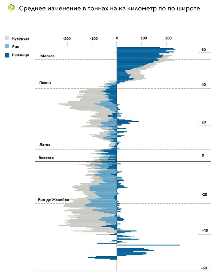 Авторы карты уверены: глобальные климатические изменения представят сельхозпроизводителям и новые возможности. Так, основными районами выращивания пшеницы должны стать Россия, Канада, Китай и северо-запад США. Пшеница лучше переносит засуху и высокие температуры, чем кукуруза, хотя вырубка лесов в этих регионах ускорит климатические изменения. Могут выиграть и несколько более жарких и бедных районов: в Индии и Западной Африке увеличение количества осадков улучшит условия для производства риса.