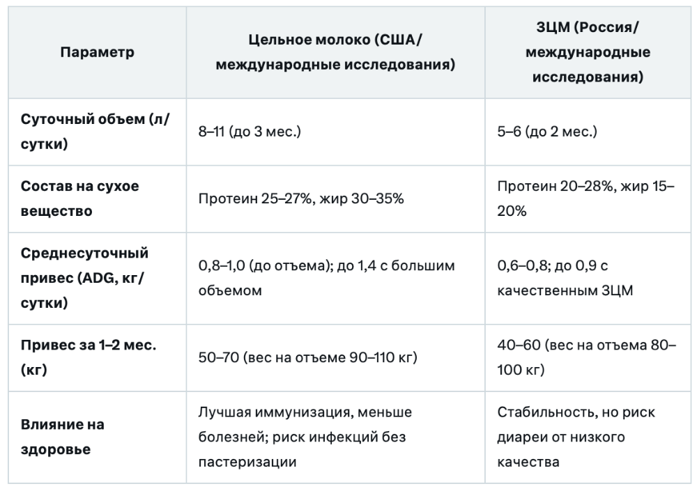 В исследовании Godden et al. (2005) телята на пастеризованном молоке набирали 0,45 кг/сутки, против 0,35 кг на традиционном ЗЦМ (20:20). В высоких объемах (accelerated feeding) ADG достигает 1,0–1,2 кг, что на 20–30% выше, чем на ограниченном ЗЦМ. Это связано с большим содержанием жира, который обеспечивает энергию для роста и резервы на стресс.