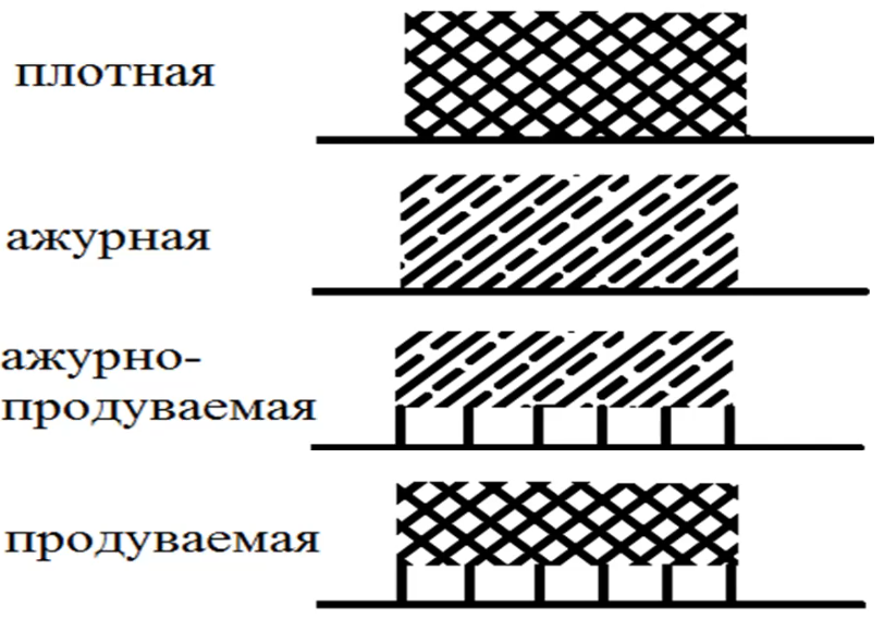 Первый тип, фактически непродуваемый, самый несовершенный, рассказывает Игорь Подлесных. Такие полосы формируются больше вдоль железных дорог, вдоль лесных дорог, где не проводятся рубки ухода. Полоса с плотной схемой способствует ветровой эрозии, поскольку воздушный поток при встрече с такой лесополосой не дробится. В лесополосе ажурной конструкции просветы расположены равномерно – они делят ветровой поток на две части. Одна, дробясь, проходит через полосу и снижает скорость, а другая переваливает через насаждения. У остальных двух типов крупные просветы в нижней части и равномерное смыкание крон.