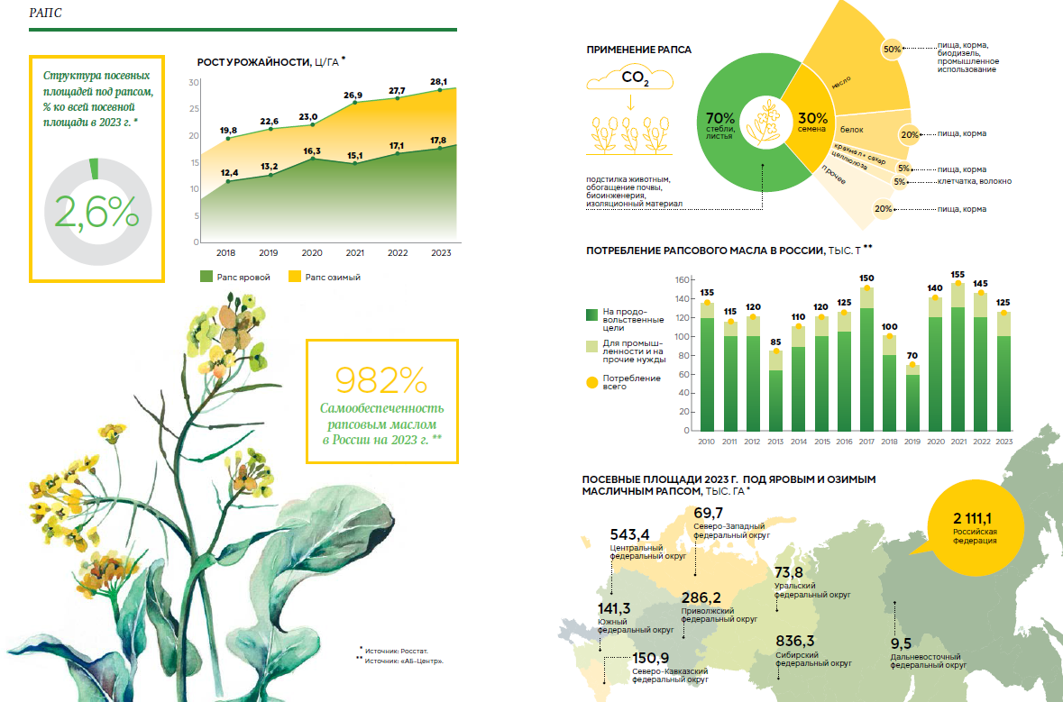 Под сою и рапс аграрии отвели рекордные площади. В 2023 году сою посеяли на 3,6 млн га, а рапс – на 2,1 млн га, но урожайность культур снизилась – в среднем по масличным с 31,6 до 28,1 ц/га.