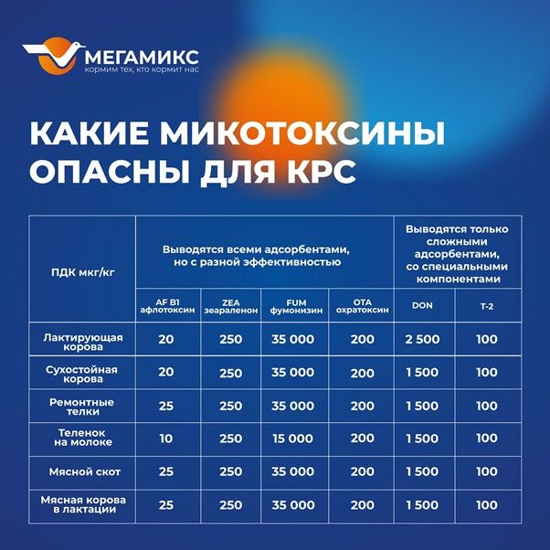 В таблице ниже представлены основные микотоксины и их допустимые уровни, которые помогут вам контролировать качество кормов и защитить стадо от скрытых угроз.