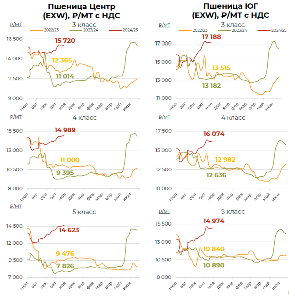 На отчетной неделе цены на пшеницу на внутреннем рынке остались практически без изменений. Колебание в обе стороны составило не более 100 руб./МТ. Высокая экспортная пошлина на зерновую культуру (ставка пошлины непрерывно повышается уже почти 2 месяца и с 30 октября по 5 ноября составляет 2 272,9 руб./МТ), а также ограниченный спрос на внешнем рынке оказывают существенное давление на портовые цены. Тем не менее, несмотря на это, внутренние цены остаются относительно стабильными за счет нехватки предложения качественной пшеницы и стабильного умеренного внутреннего спроса. СХТП во всех регионах продолжают придерживать запасы в ожидании повышения цен. В то же время поддержку ценам на фуражную пшеницу оказывают комбикормовые предприятия. Мукомольные предприятия стараются предотвратить укрепление цены, но по мере необходимости пополнения запасов, осуществляют покупки продовольственной пшеницы. С учетом этого, возможно сохранение стагнации цен в краткосрочной перспективе, пока не будут вынуждены пойти на существенные уступки либо покупатели, либо продавцы.