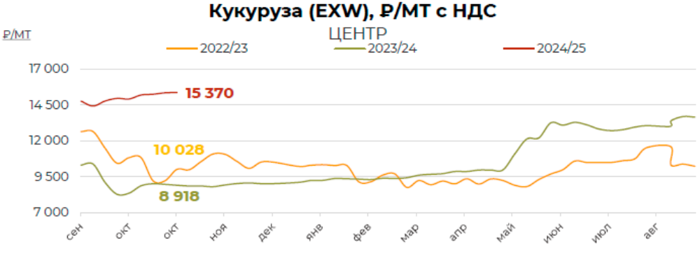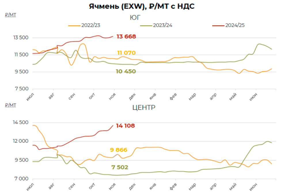 За отчетный период цены на кукурузу на Юге, в Центре и Поволжье остались на предыдущем уровне. Поддержку ценам оказывают умеренный спрос и ожидаемое сокращение производства зерновой культуры в текущем сезоне. Давление идет со стороны высокой экспортной пошлины, ставка которой с 30 октября составляет 2 702,1 руб./МТ. По состоянию на 29.10 в России намолочено 9,8 ММТ кукурузы против 9 ММТ за АППГ при урожайности 49,9 ц/га против 66,9 ц/га в АППГ, обмолочено уже 2 МГА против 1,3 МГА за АППГ.