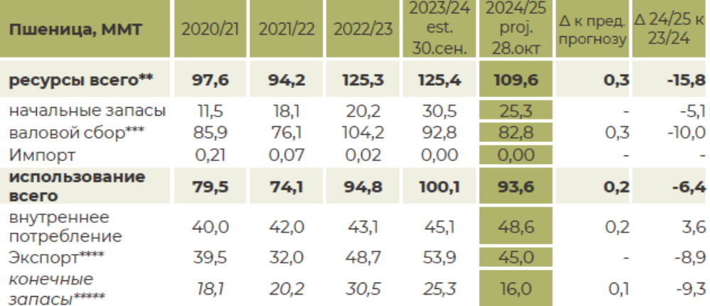 На фоне неблагоприятных погодных условий в стране в середине 2-го квартала 2024 года, а также сокращения посевных площадей пшеницы и ячменя, прогноз валового сбора всех трех основных зерновых культур значительно ниже прошлого сезона и оценивается на уровне: пшеницы 81–84 ММТ, ячменя – 16,5- 17,5 ММТ, кукурузы – 11,5–13 ММТ. При этом в связи с более высокими данными по урожайности в Поволжье «Агроэкспорт» повысил прогноз валового сбора пшеницы в сезоне 2024/25 до 82,8 ММТ. Стоит отметить, что возможны дальнейшие корректировки прогнозов.