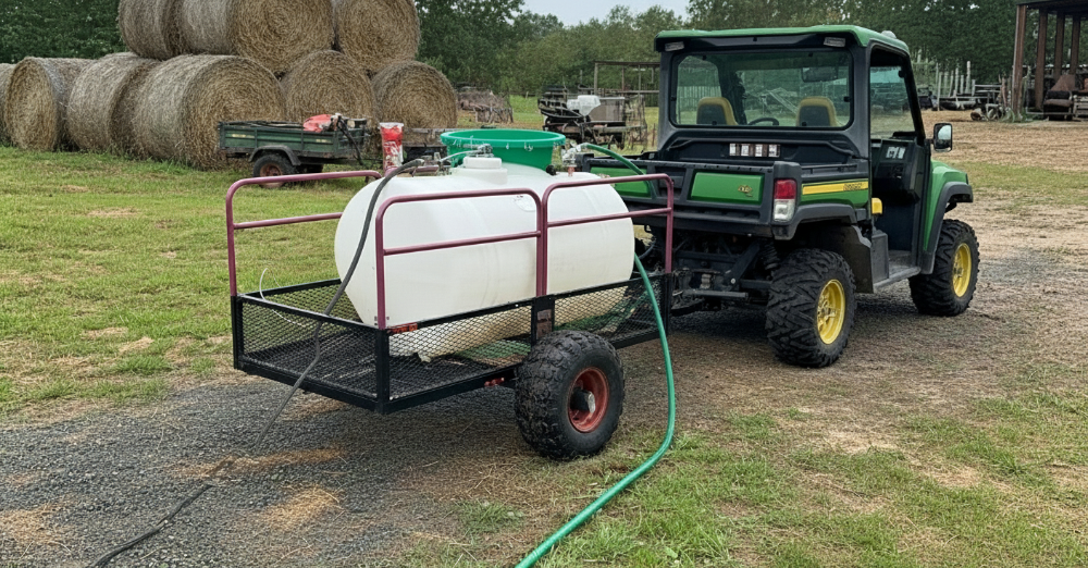 Система работает следующим образом: резервуар для воды устанавливается на прицеп и закрепляется стяжными ремнями. Запорный клапан в нижней части подсоединяется к садовому шлангу, который, в свою очередь, подключен к автоматическому поплавковому клапану в резервуаре для скота. Когда животные пьют, поплавковый клапан автоматически наполняет резервуар, поддерживая доступ к свежей воде без постоянного контроля.