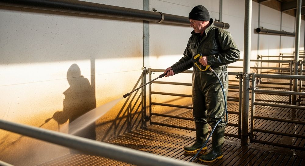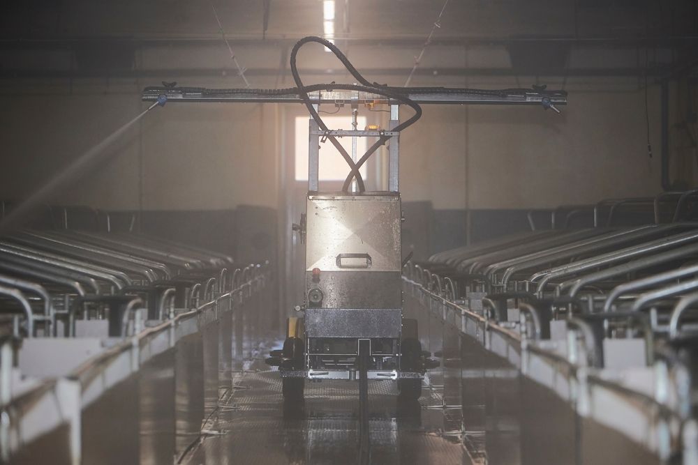 Процесс дезинфекции включает три этапа: сначала удаляют видимые загрязнения (навоз, фекалии и пыль) сильным потоком горячей воды. Затем для полного устранения остатков органических веществ используют детергент. И в самую последнюю очередь пускают в ход дезинфицирующие средства.