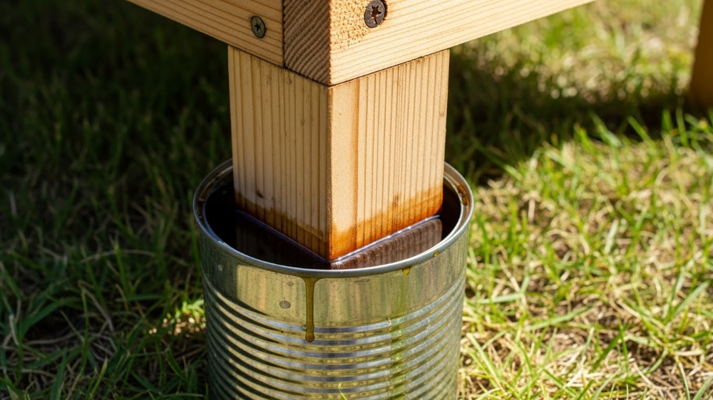 - Ножки улья в «водяных крепостях». Возьмите четыре металлические банки (например, из-под консервов), наполните их отработанным машинным маслом или просто водой, и поставьте в них ножки улья. Муравьи — отличные строители, но не пловцы. Этот ров шириной в сантиметр для них непреодолим. Раз в месяц проверяйте уровень жидкости, особенно в жару.