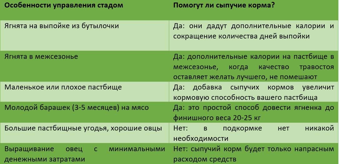 Сыпучие корма обеспечивают пастбищным животным дополнительные калории. Концентратами нередко докармливают ягнят, но не овцематок: на хороших пастбищах взрослым овцам не нужна подкормка. Кормление животных «сыпучкой» в вашей ситуации может быть неэкономично.