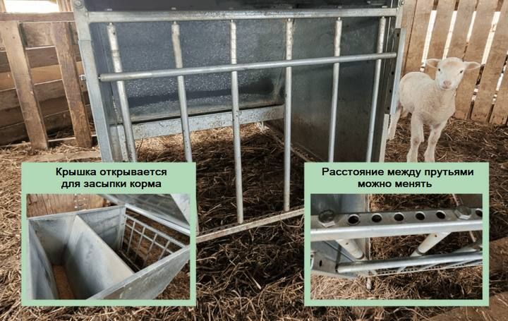 Обычно концентрированные корма кладут в специальную кормушку – она представляет собой огороженное пространство, куда овцы попасть не могут. У нее, как правило, есть дверца с вертикальными планками, пространства между которыми хватает для ягнят, но не для овец.
