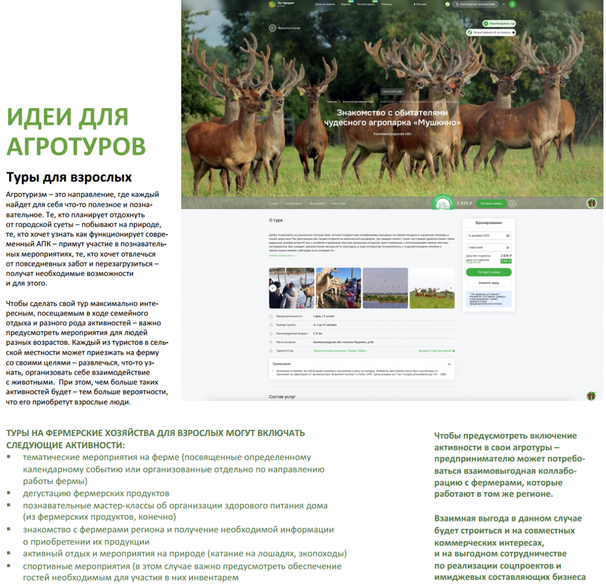 С другими вариантами агротуров (сбор урожая, кемпинг, дни рождения, свадьбы, корпоративы, семейные праздники на ферме, йога-ретриты и мероприятия для людей, которые ведут здоровый и спортивный образ жизни, мини-зоопарк, активный отдых на ферме, фермерские ужины и гастротуры на сельхозпредприятие) вы можете ознакомиться в полной версии обучающего пособия.