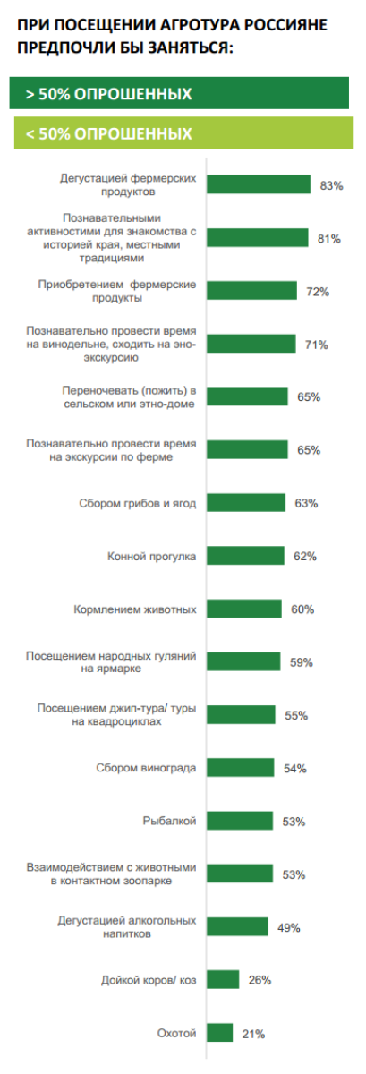 Шесть из десяти россиян хотели бы посетить объекты агротуризма в качестве туриста. Наиболее привлекательные направления – дегустация и покупка фермерских продуктов, знакомство с историей края.