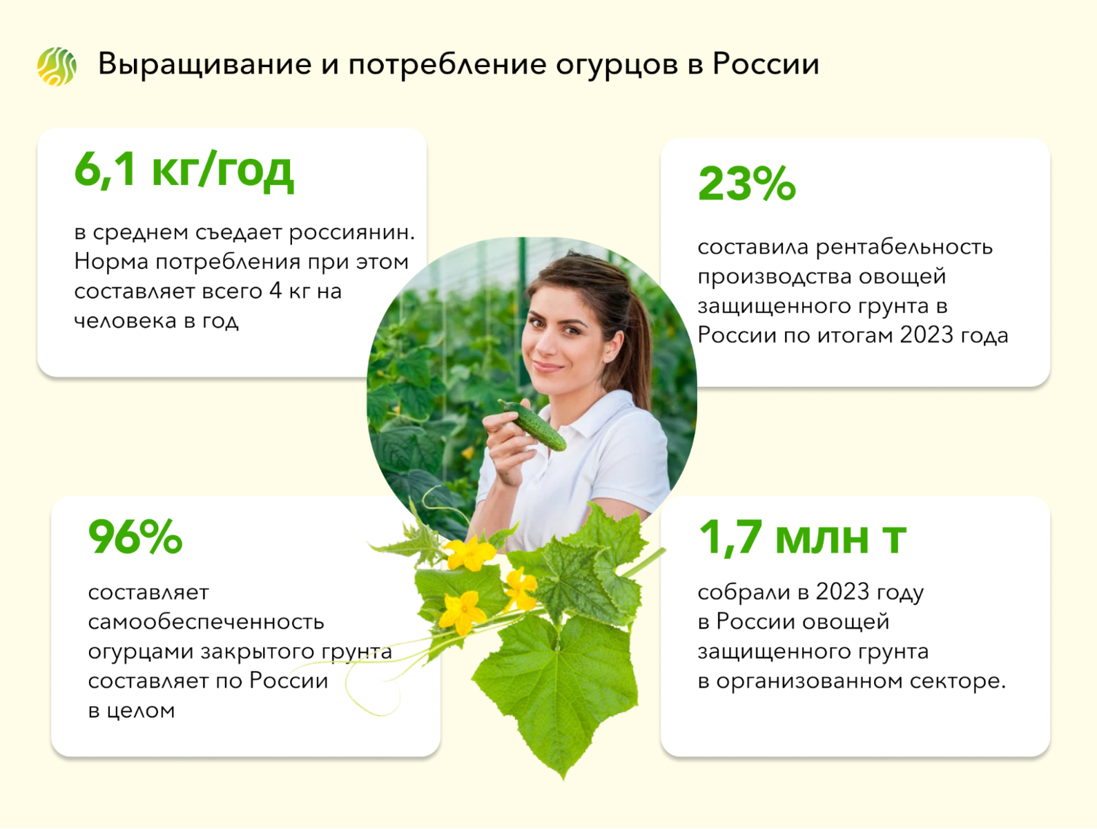 Факт: при норме потребления 4 кг огурцов на одного человека в год россияне съедают за год 6,1 кг/чел. Рентабельность производства овощей защищенного грунта в России по итогам 2023 года составила 23%. Едят все чаще отечественные огурцы, они хорошо растут в теплицах даже на Крайнем Севере. И это отличная бизнес-идея для фермера