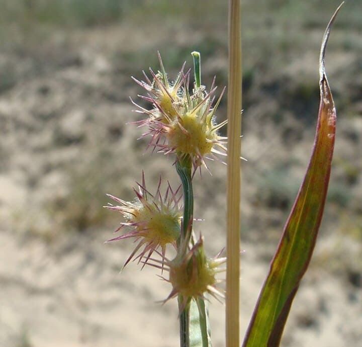 Соцветие – прерывистая кисть из 8-20 колосков, расположенных по одному или несколько вместе. Колоски 1–3-цветковые, округлые, колючие. Колосковые чешуи желто-зеленого цвета, грубые, деревянистые, усажены многочисленными сросшимися у основания колючками. Длина колосков с колючками 10-11 мм, толщина 8-9 мм. Плод – зерновка, светло-коричневая, плоская, овальная, длиной 2,1-3,5 мм, шириной 1,8-2,3 мм, толщиной 1,0-1,4 мм с плодовым рубчиком в виде небольшого черного пятнышка. В одном колоске 2, реже 1 или 3 зерновки. На одном растении от 20 до 3000 зерновок.