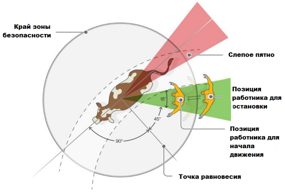 Граница зоны безопасности и точка равновесия имеют решающее значение для работы со скотом с низким уровнем стресса. Все работники, имеющие дело с КРС, должны понимать поведение скота, особенно его зону безопасности, как в теории, так и на практике.