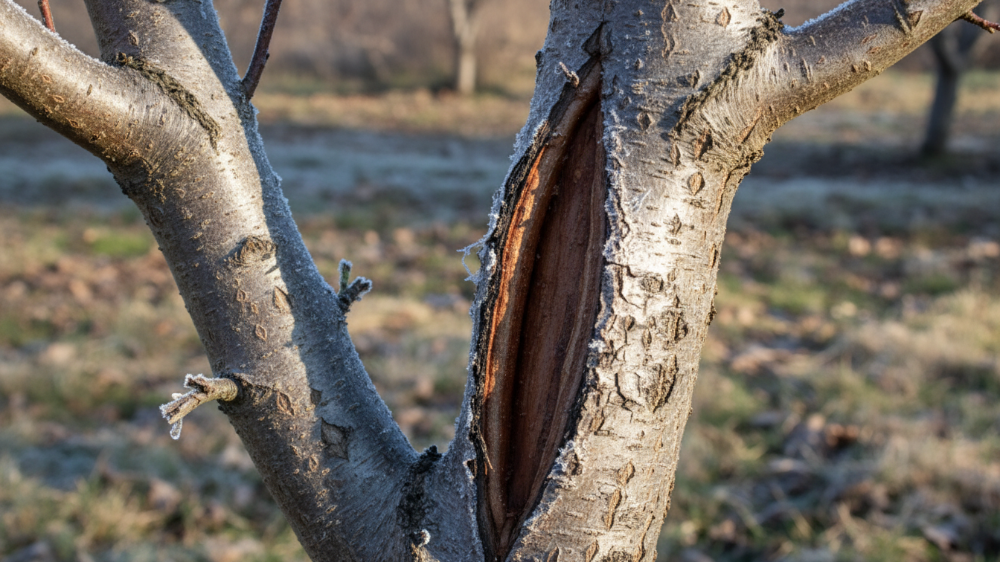 Морозобоины — это физическое повреждение, локальная травма. Растение может с ним справиться, отгородив пораженный участок, и потеря будет ограничена частью кроны. Вертициллез — это системное инфекционное заболевание. Гриб Verticillium dahliae живет в почве, проникает через корни, заселяет проводящие сосуды по всему дереву и в конечном итоге убивает его полностью. Лечения от вертициллеза нет, и зараженное дерево является угрозой для соседних косточковых (абрикос, вишня, слива) и даже некоторых ягодных культур.