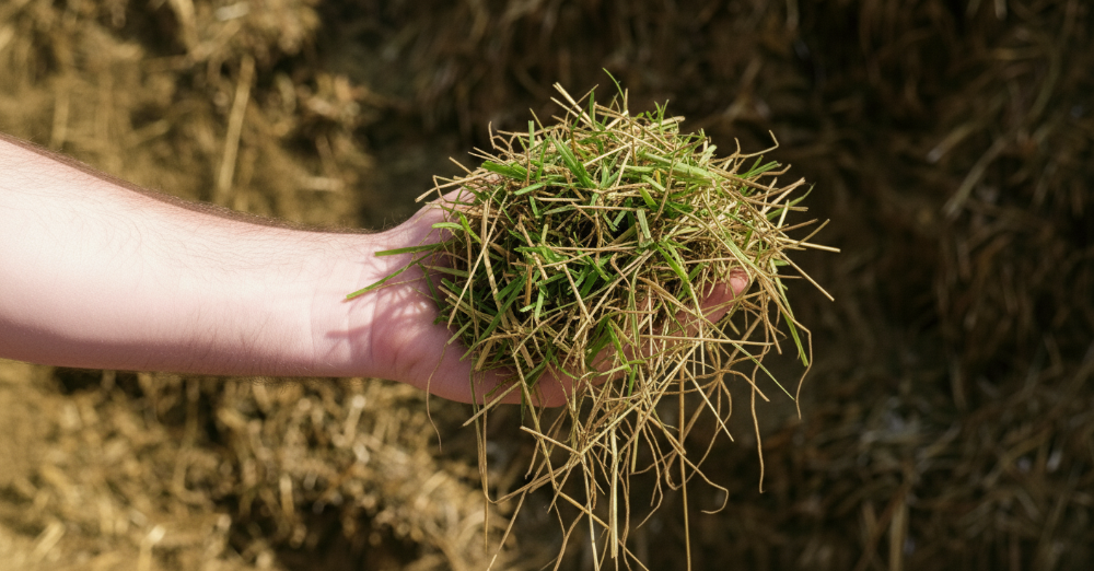 - Возьмите сухое сено или солому (влажность <20%) в пропорции 1:5 (1 часть сухого на 5 частей сенажа)