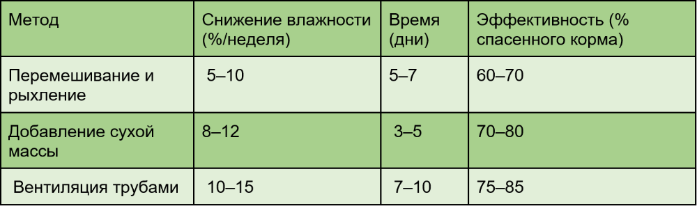 Эффективность: Снижает влажность на 10–15% за 10 дней. В США метод популярен на малых фермах, где нет консервантов, и спасает до 80% сенажа.