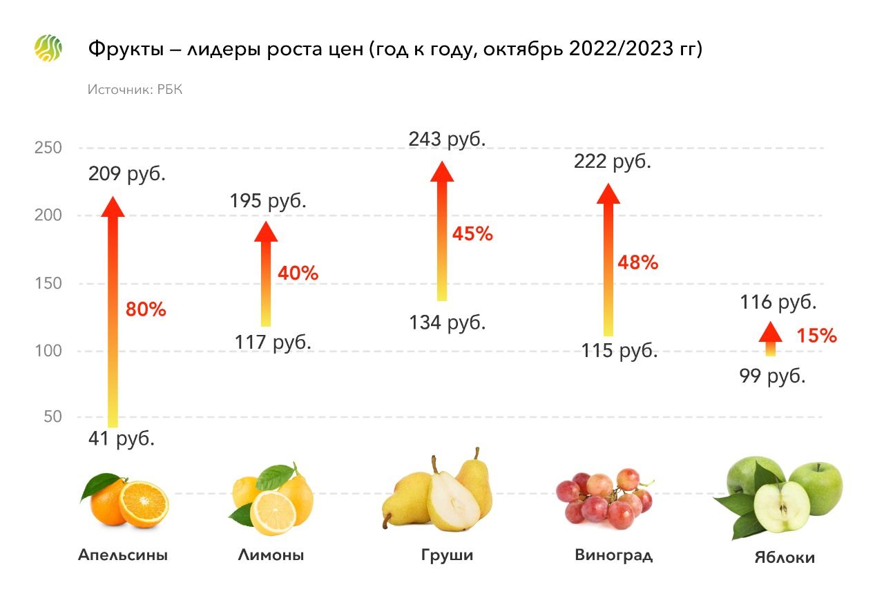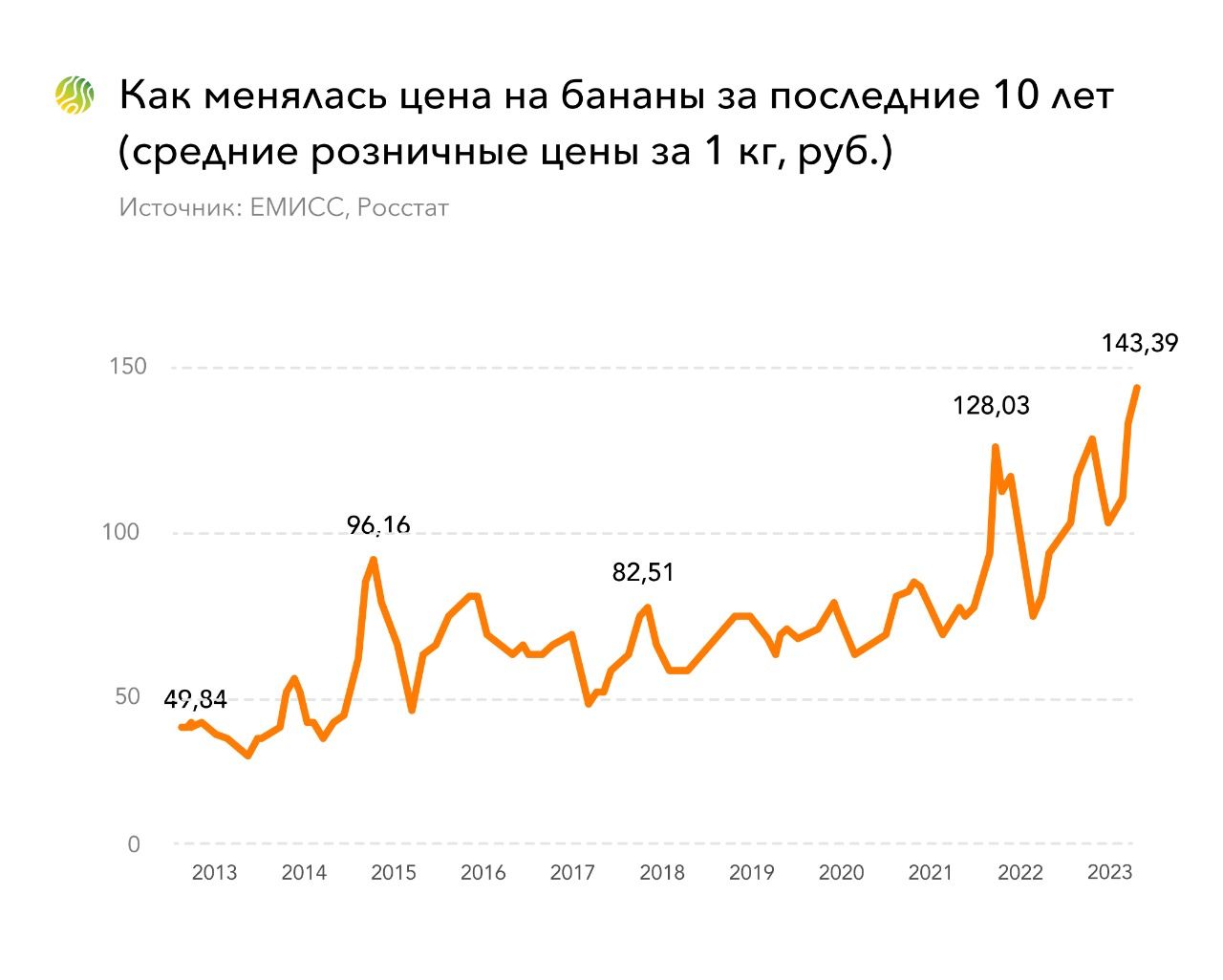 Начав подниматься в феврале (+15% к уровню февраля 2022 года), в октябре-ноябре 2023 года цена 1 кг бананов по данным Росстата совершила резкий скачок и достигла рекордного уровня за 5 лет – 143 рублей.