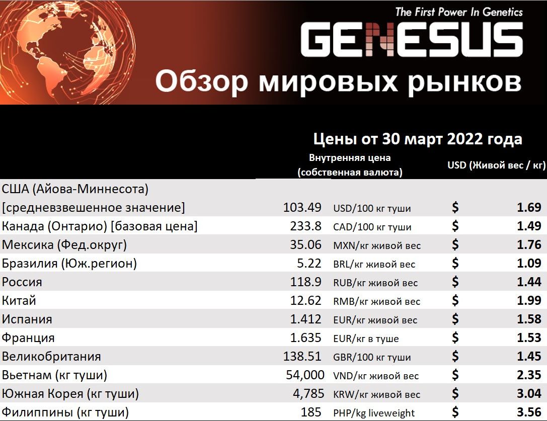 Цена на свинину в Таиланде падает, так как правительство ограничивает накопление резервов. Достигнув в январе рекордного уровня в 120 THB/ кг ($3.5 US), в конце марта цены на живых свиней в Таиланде упали на 30% до 80 THB/ кг ($2.35 US). Правительство выставило ограничения и сейчас запасы свинины на любых скотобойнях и холодильных хранилищах не должны превышать 5 000 кг.