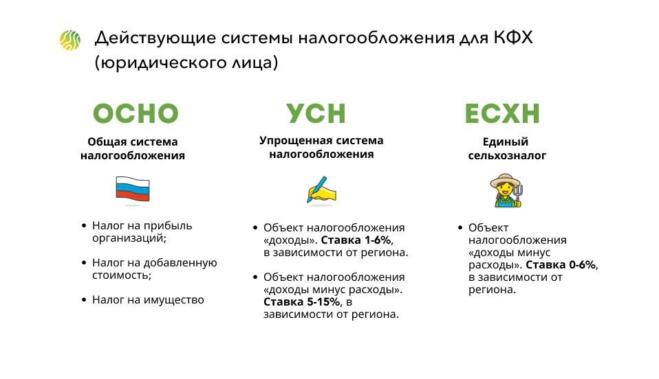 Согласно Налоговому кодексу, крестьянско-фермерское хозяйство (юридическое лицо) может выбрать одну из действующих систем налогообложения. В зависимости от этого, КФХ уплачивает те или иные налоги.