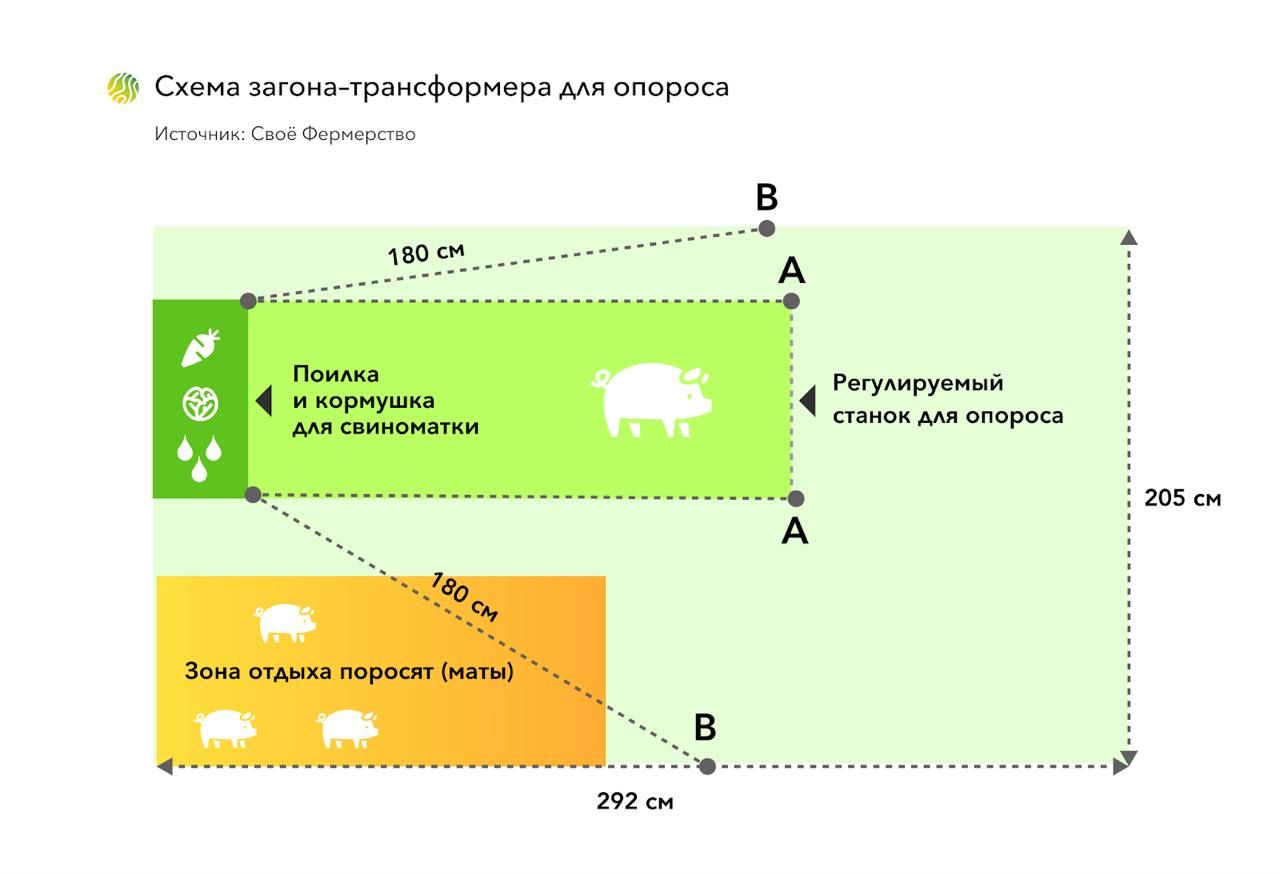 Рисунок 1: Схема загона для опороса в исследовании. В позиции А свиноматка помещена в клетку. Прутья клетки можно открыть до положения B, при котором свиноматка свободно перемещается внутри загона. Зона отдыха поросят в любом случае недоступна для свиноматки.