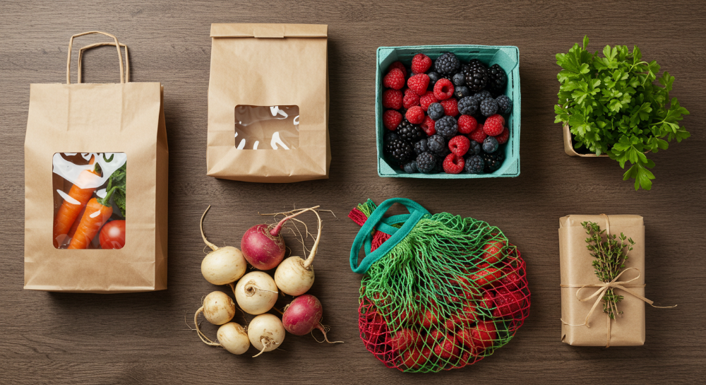 Сетчатые мешки с яркой этикеткой удобны для лука или свeклы, а деревянные ящики с выгравированным логотипом добавляют премиальности и подходят для поставок в рестораны. Ягоды (клубнику, малину, голубику, смородину и т.п) лучше упаковывать в картонные корзинки с цветной наклейкой или прозрачные пластиковые контейнеры с брендированной этикеткой. Для зелени, вроде укропа или петрушки, идеальны бумажные обeртки с лентой или пакеты с перфорацией, которые продлевают свежесть.