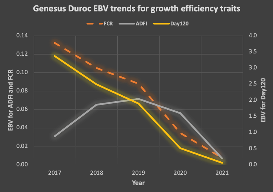 С помощью модели геномной оценки множественных признаков мы можем получать точный расчет племенной ценности как по среднесуточному потреблению корма, так и по возрасту достижения веса 120 кг, а затем провести оптимальный упор на среднесуточное потребление корма и возраст достижения веса 120 кг в селекционном индексе. Таким образом мы можем отбирать свиней, имеющих генетическую предрасположенность к более быстрому росту при минимальном изменении уровня потребления корма, что приведет к улучшению конверсии корма. Динамика генетических изменений по среднесуточному потреблению корма и возрасту достижения веса 120 кг наряду с расчетом племенной ценности по коэффициенту конверсии корма в нашей популяции Дюроков представлена ниже на графике. Начиная с 2017 года, когда оба эти признака были включены в расчетный индекс племенной ценности и соответствующим образом акцентированы, мы отмечаем неизменное улучшение по скорости роста (снижение числа дней до набора веса в 120 кг/ 265 фунтов) при ограниченном изменении по уровню потребления корма. Результаты работы показывают, что коэффициент конверсии корма неуклонно улучшается за счет улучшения роста без существенного изменения в уровне потребления корма.