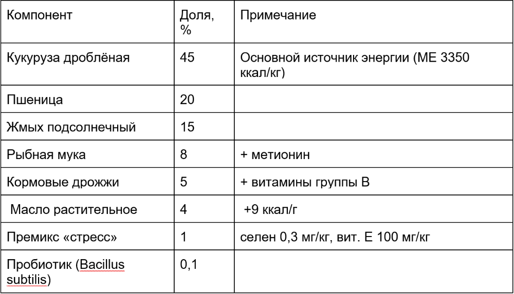 Изменение меню птицы на время стресса — рабочий инструмент фермера. Это временный (на 3–7 дней) рацион, который компенсирует дефицит тепла, влаги и микроэлементов, пока организм не адаптируется. Ниже — три проверенные схемы, которые можно собрать из доступных компонентов.