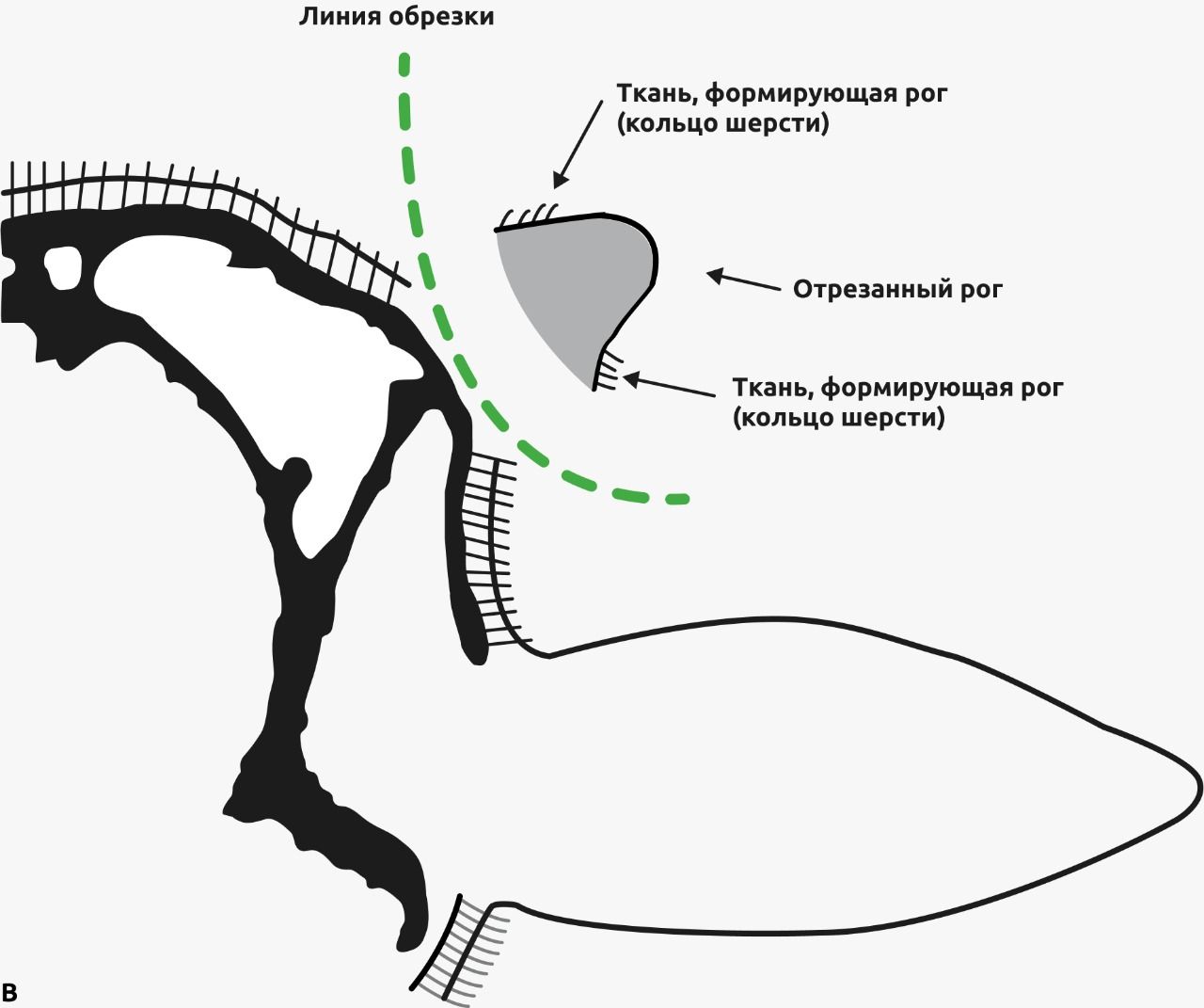 Чтобы рог не начал расти снова после удаления, оператор должен удалить ткань, формирующую рог. Для этого нужно удалить кольцо кожи с шерстью шириной не менее 1 см (показано на рисунке).