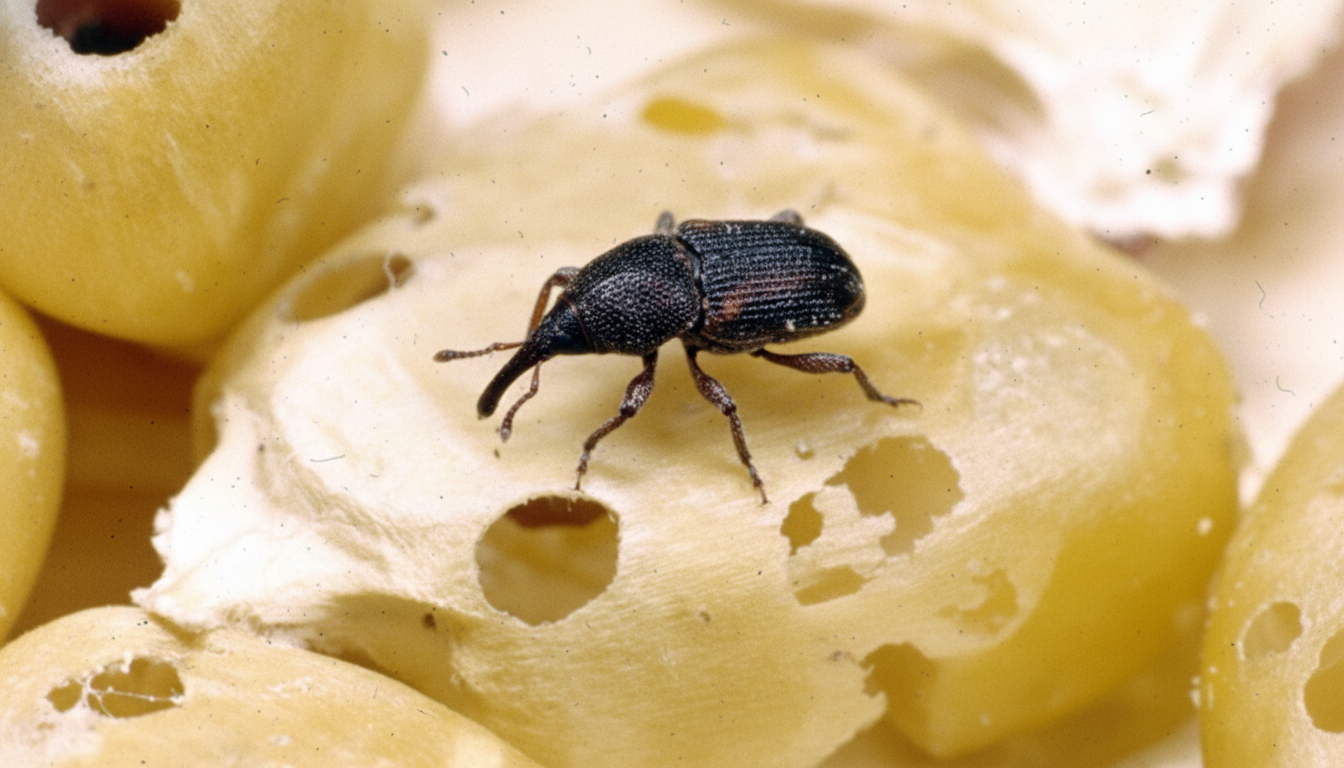 Воронеж, сентябрь. Фермер с 1200 тоннами пшеницы замечает дырочки в зерне и мучку в углу амбара. Это рисовый долгоносик — жук 2–3 мм с длинным хоботком. Он откладывает яйца внутрь зерновки, личинка выедает сердцевину, и через 3 месяца одна самка дает 300 потомков.