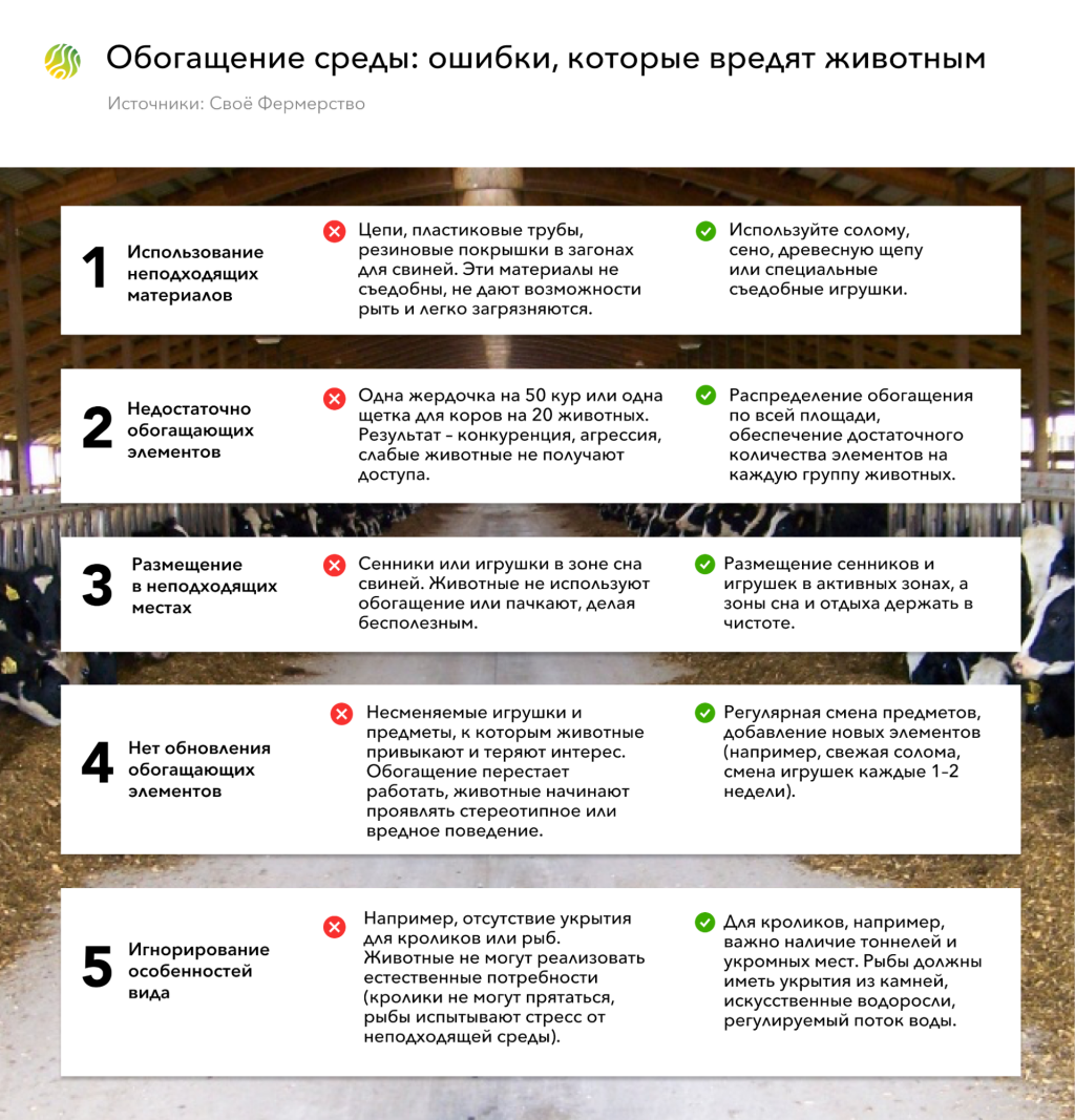 Обогащение среды для сельскохозяйственных животных – это приближение их образа жизни к природному, максимальное удовлетворение естественных потребностей. Подобные изменения не только делают подопечных фермера довольными, но и увеличивают их продуктивность
