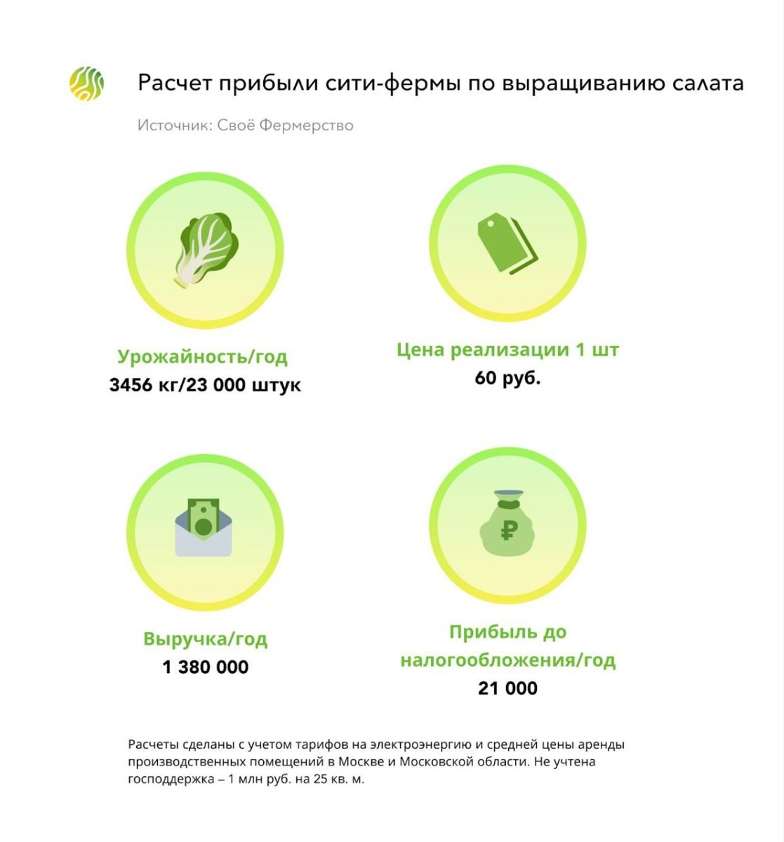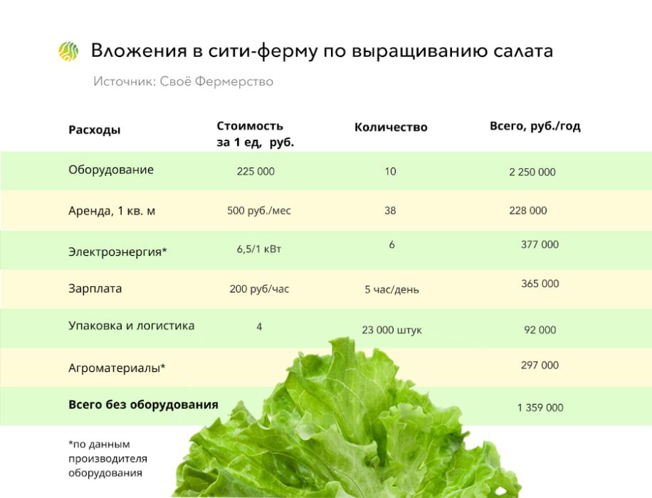Главный вопрос любого бизнеса прибыль. Сделаем примерный расчет вложений и доходов, и посмотрим, насколько прибыльна может быть сити-ферма. Например, планируется выращивать салат.
