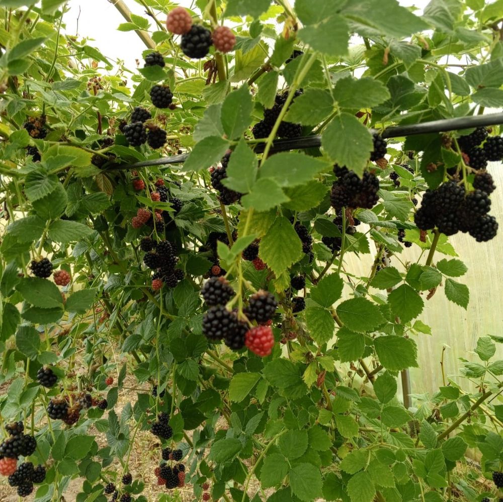 У меня построено больше 20 теплиц, но основное — это открытый грунт. И там, и там растёт ежевика, малина и клубника. В теплицах в этом году, кроме ягод, я выращивал огурцы и помидоры.